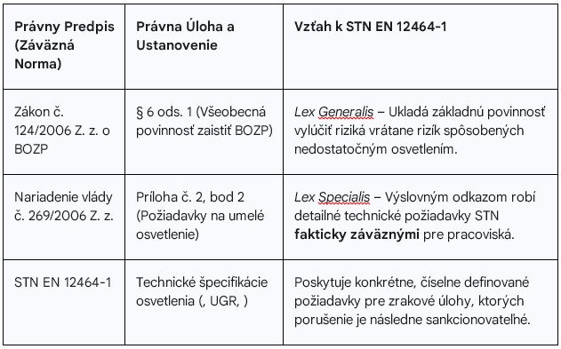 Norma STN EN 12464-1 však získava právnu záväznosť nepriamym odkazom (incorporation by reference). Tento mechanizmus znamená, že legislatívny predpis vyššej právnej sily na normu výslovne odkazuje, čím sa technické detaily normy stávajú integrálnou a vynútiteľnou súčasťou právnej povinnosti.
