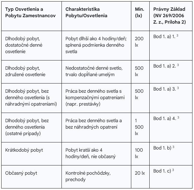 Existuje teda duálny systém kontroly: Musí byť splnený minimálny rámec celkovej osvetlenosti podľa NV č. 269/2006 Z. z. a zároveň aj detailné, často prísnejšie požiadavky STN EN 12464-1 pre samotné zrakové úlohy.