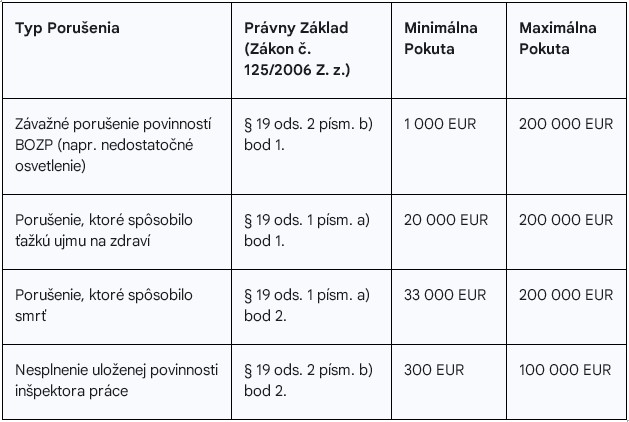 Výška pokút za porušenie povinností BOZP, medzi ktoré patrí aj zabezpečenie adekvátneho osvetlenia podľa STN EN 12464-1, je definovaná v § 19 Zákona č. 125/2006 Z. z. o inšpekcii práce.